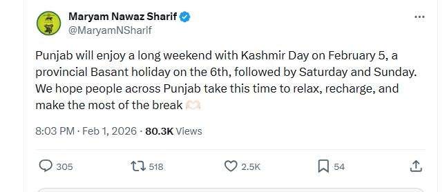 The announcement was shared by Maryam Nawaz, confirming holidays on February 5 and February 6, followed by Saturday and Sunday.